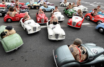 Children react after competing in a pedal car race as motoring enthusiasts attend the Goodwood Revival, a three day classic car racing festival celebrating the mid-20th century heyday of the sport, at Goodwood in southern Britain.